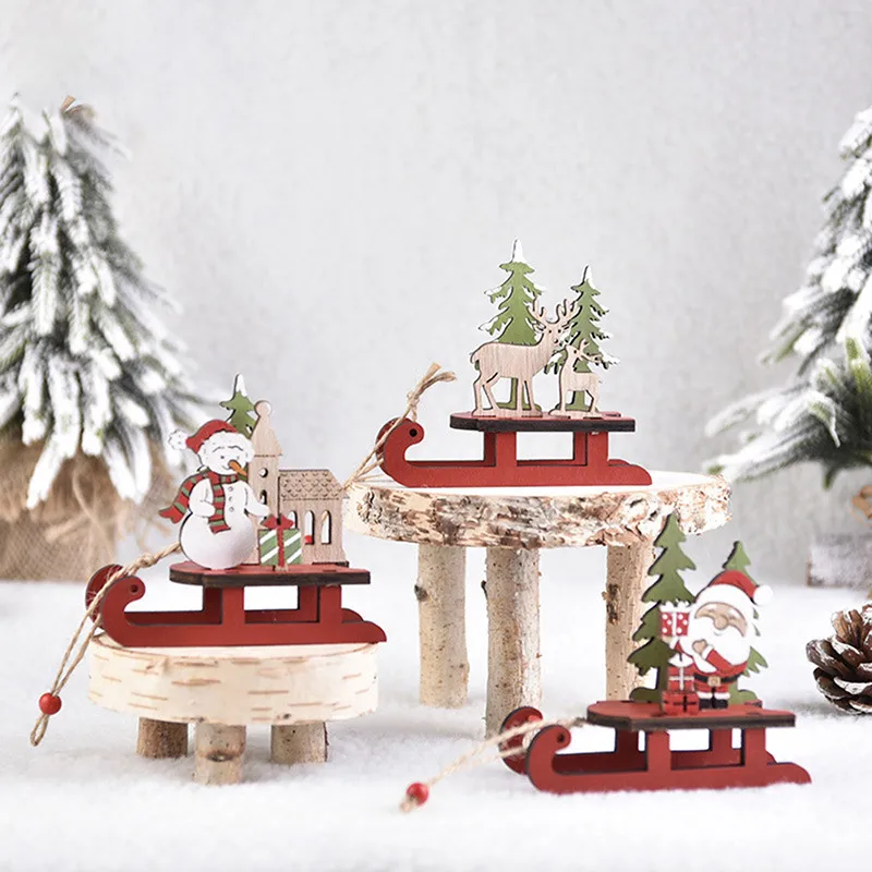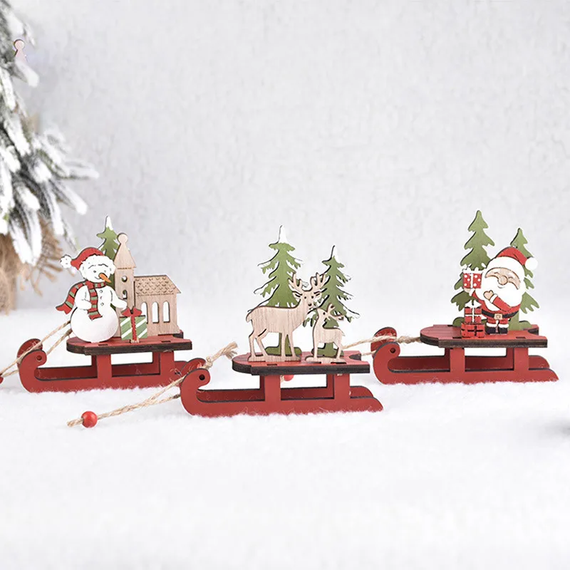 Christmas Ornaments Wooden Sleigh Santa Claus Snowman Elk Sled Pendant For Christmas Tree Home Party Decor Xmas Decoration Gift